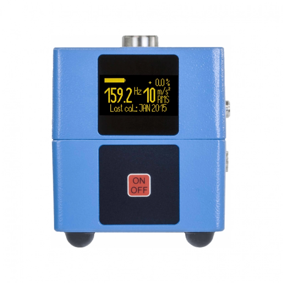The VC20 is a simple portable vibration calibrator with fixed amplitude 10 m/s² at 159.2 Hz, load independent up to 600g, suitable for quick calibration of acceleration/velocity/displacement sensors with quartz controlled and battery operation.